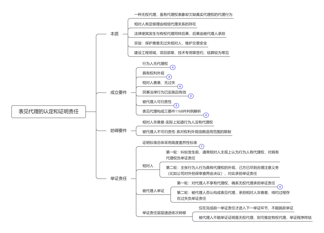 最后,就表见代理类案件中举证责任分配问题,阐明总体上举证责任采用高度盖然性标准,介绍相对人和被代理人各自举证责任,强调举证责任层层递进依次转移的举证规则。
